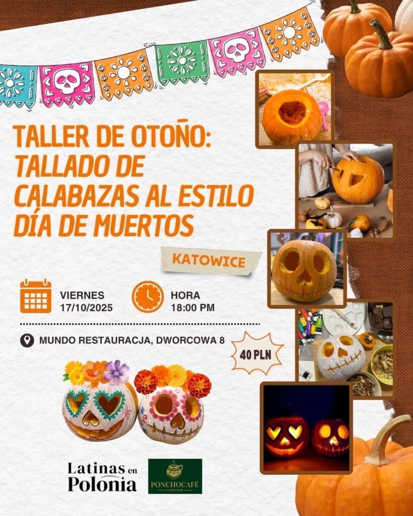 Spanish version 🎃 Taller de Otoño: Tallado de calabazas al estilo Día de Muertos ¡Celebra el espíritu del otoño y el Día de Muertos con creatividad y color! Te invitamos a participar en nuestro taller, donde aprenderás a tallar y pintar tu propia calabaza inspirada en las tradicionales Catrinas mexicanas. 🗓 Fecha: Domingo,19 de octubre, 2025🕕 Hora: 12:00 p.m.📍 Lugar: Mundo Restauracja, KatowiceIdioma: Inglés-Español Costo: 40 PLNEvento mixto (hombres y mujeres). Registro individual. No necesitas experiencia previa: te guiaremos paso a paso para crear una pieza original que refleje tu estilo y creatividad.✨ Incluye todos los materiales.Una vez enviado el formulario te llegará un correo con los detalles del pago. ¡Te esperamos! 🧡 ……………………………………………………… English version 🎃 Autumn Workshop: Pumpkin Carving Día de Muertos Style Celebrate the spirit of autumn and Día de Muertos with creativity and color! Join our workshop where you’ll learn how to carve and paint your own pumpkin inspired by the traditional Mexican Catrinas. 🗓 Date: Sunday, October 19, 2025 🕕 Time: 12:00 p.m. 📍 Location: Mundo Restauracja, Katowice Language: Spanish and EnglishCost: 40 PLN Mixed event (men and women). Individual registration required. No previous experience needed — we’ll guide you step by step to create a unique piece that reflects your own style and creativity.✨ All materials are included. Once you submit the registration form, you’ll receive an email with payment details. We can’t wait to see you there!